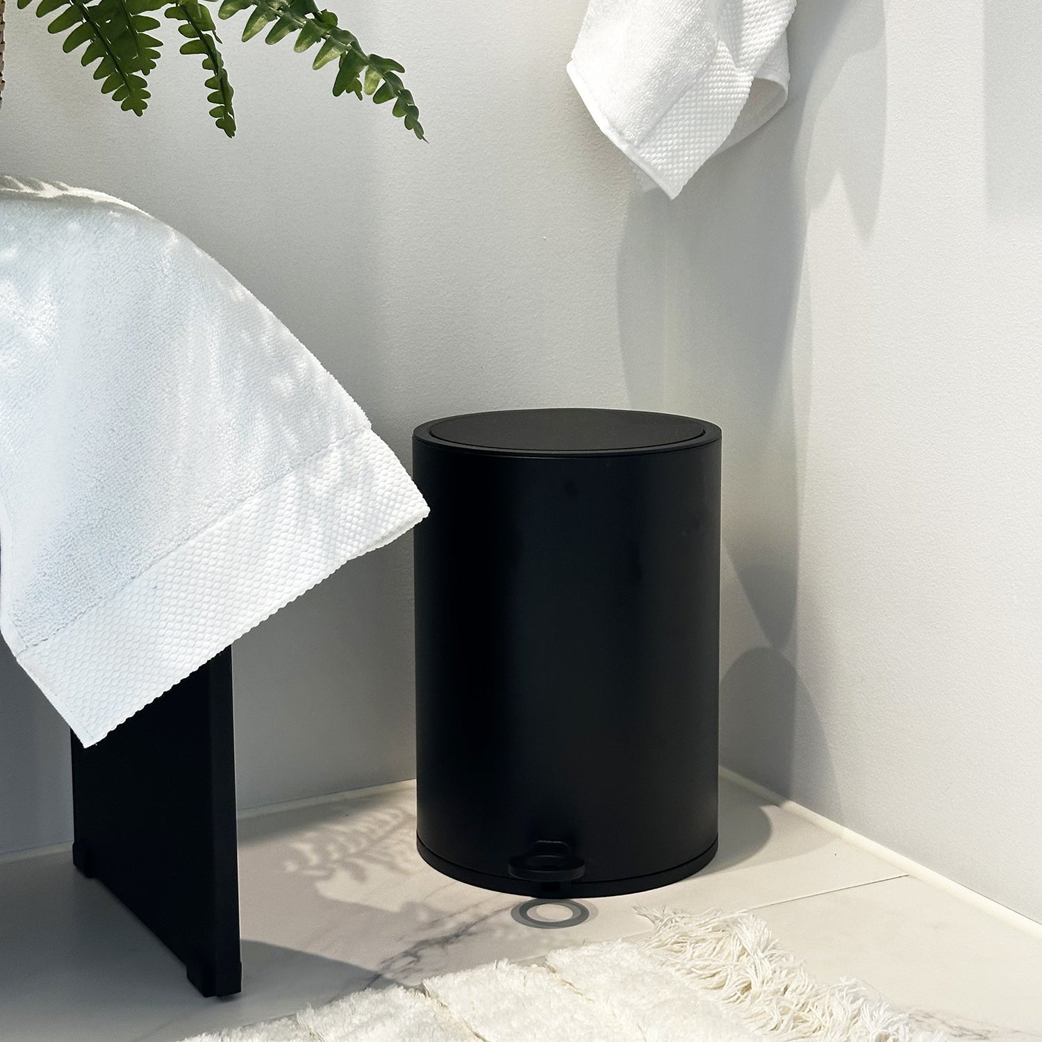 OUTLINE LITE Pedal bin 6l. Soft Close. Matte Black Stainless Steel. Height 300 mm. Diameter 215 mm. Black polypropylene thermoplastic easy clean inner liner.
