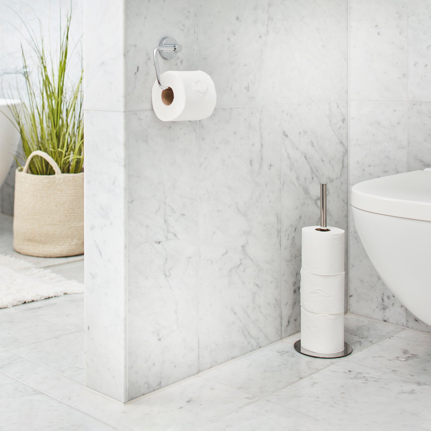 OUTLINE Spare Toilet Roll Holder. Free standing model. For 3 rolls. Polished Stainless Steel. Our spare toilet roll holder combines sleek design with everyday functionality. Discreet and elegant.