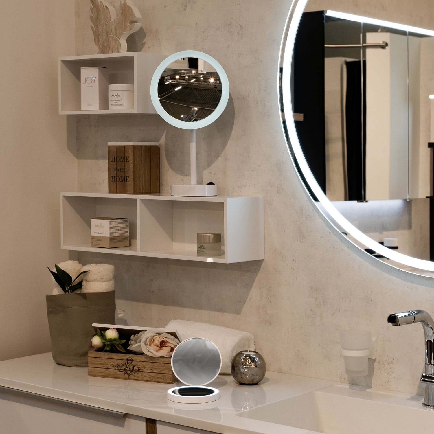 OUTLINE Shaving/Make-up Mirror with LED-technology. White. PMMA Frame. Free Standing. Battery operated with 4 pcs. 1.5V AA batteries (not included). Dual Light (warm and cool light). Magnifies 5 times. Mirror Diameter 200 mm. Height 380 mm.
