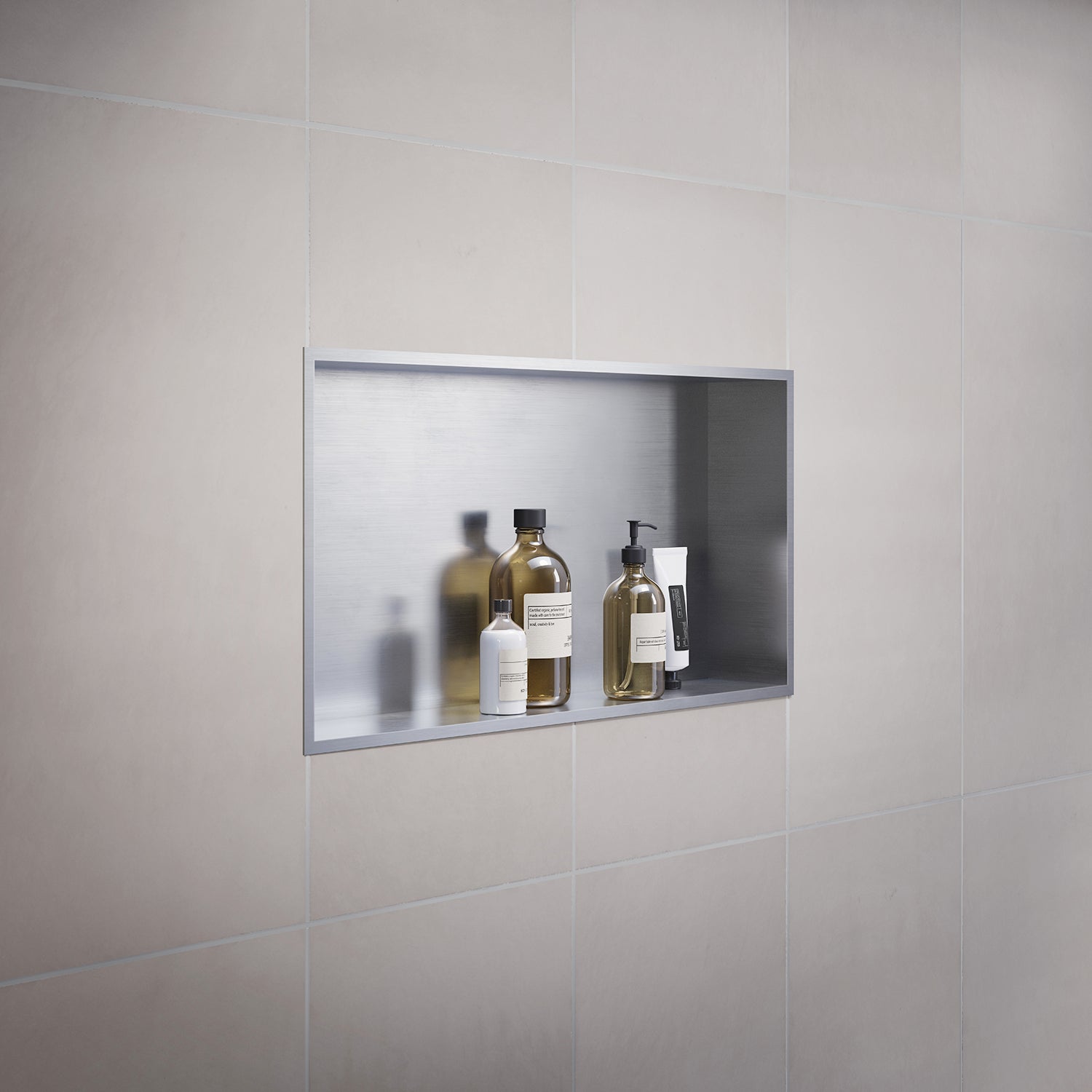 SIDELINE Shower and bathroom wall niche. Brushed stainless steel. To be built into to the wall. Height 300 mm. Length 600 mm. Depth 100 mm.